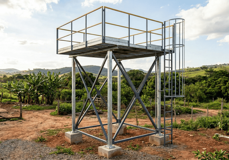 Estruturas seguras e resistentes para suporte de reservatórios de sistemas contra incêndio, garantindo estabilidade e conformidade com as normas técnicas.
